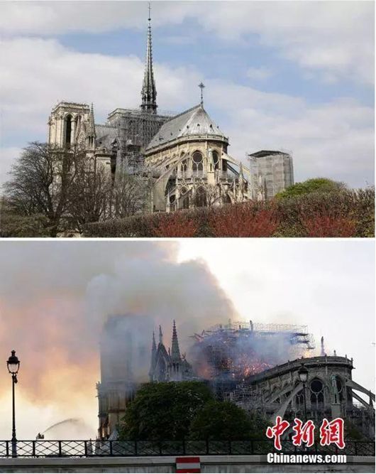 巴黎圣母院火灾前后对比(图片来源:中新网)