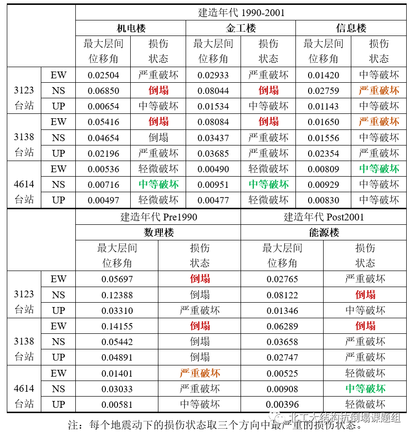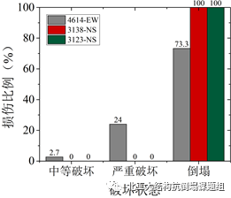 无论是按规范设计的规则结构、正在服役的真实结构、还是大尺寸试验结构模型,在此次地震下的震损情况均较为严重,尤其是在中长周期地震动3123和3138下(仅考虑单向地震作用)结构大多发生了倒塌(仅有一栋未倒塌)。对于强度最大的短周期地震动4614,结构也发生了从轻微到倒塌的不同程度损伤。