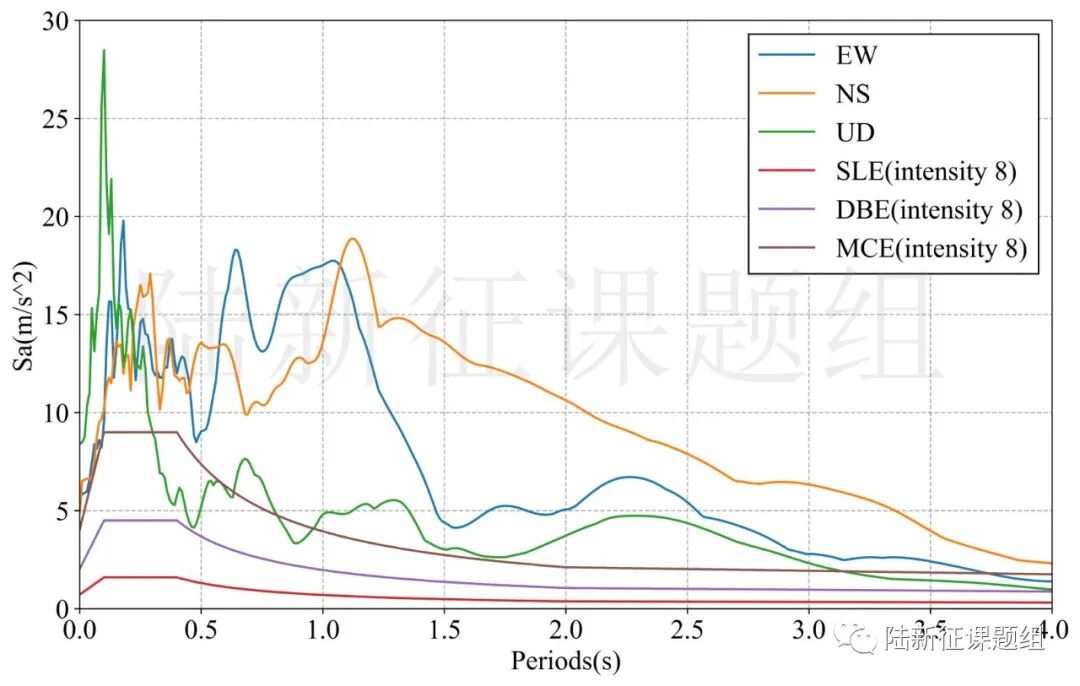 图2给出了三条地震动记录的反应谱以及我国规范设计反应谱。可以看出,本次土耳其地震作用远超过了用于一般抗震分析的8度罕遇地震作用、甚至也超过了最高的9度罕遇地震作用,超过了一般设计考虑的场景。