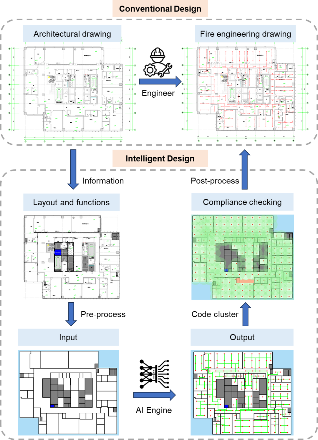 针对这些问题,香港理工大学与清华大学的研究团队合作,提出了一种基于人工智能的喷头布置自动化方法[2]。通过训练生成式深度学习模型,使其学习建筑平面与喷头布局之间的关系,模型能够在给定输入建筑图纸和火灾危险等级后,自动生成符合规范要求的喷头布置方案。这一方法不仅帮助工程师从重复、耗时的图纸绘制中解放出来,还使其能够将更多精力投入到更具综合性和判断力的设计决策中。