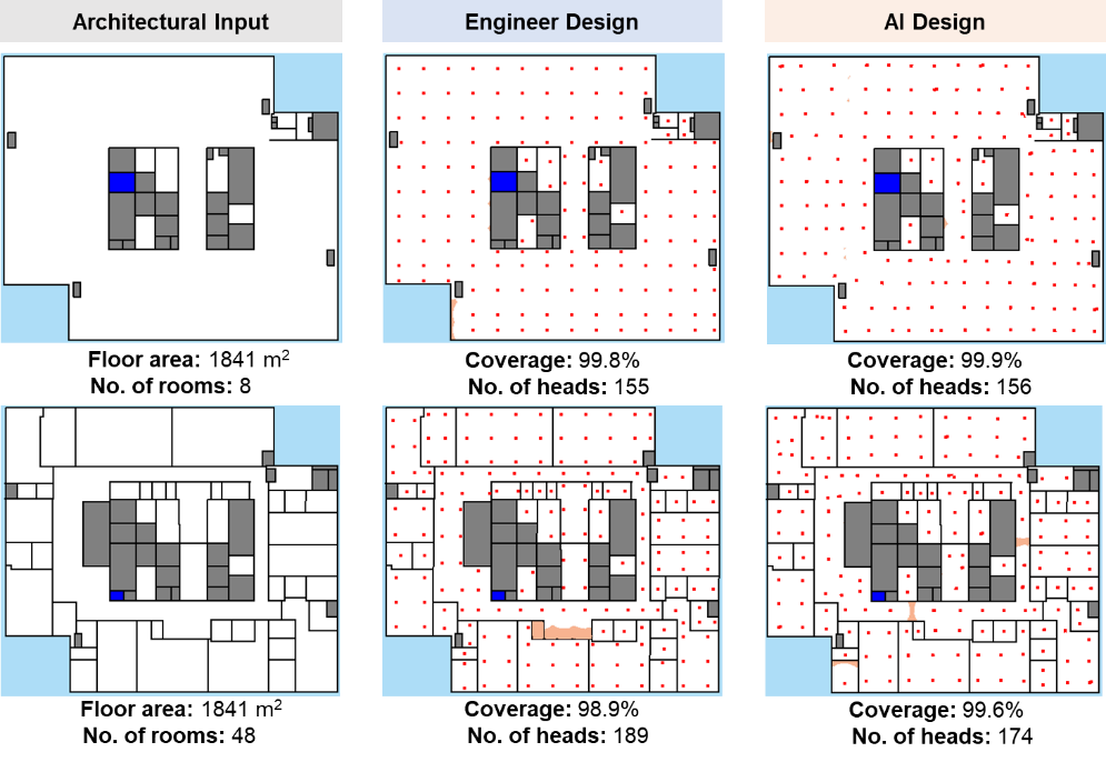 图中左列为建筑平面输入,中列为工程师人工设计结果,右列为 AI 自动生成的设计方案。从覆盖率来看,两种方案均实现了较高的喷淋保护,且 AI 的设计在两个案例中略优于人工设计,覆盖率分别达到了 99.9% 和 99.6%。在喷头数量上,AI 的设计与人工设计所需数量极为接近,甚至在第二个案例中略少于人工设计。