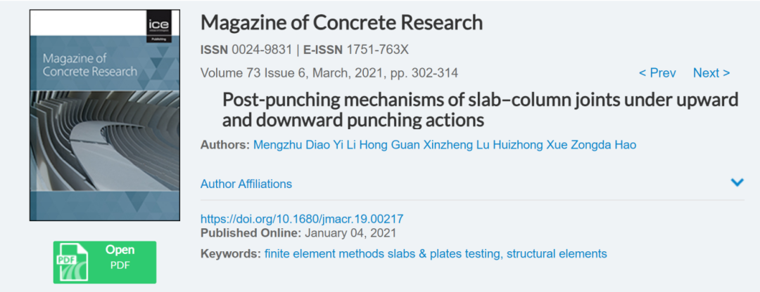 近日,北京工业大学李易副研究员与澳大利亚Griffith大学关红教授,清华大学陆新征教授等人合作,围绕板柱节点在冲剪破坏后大变形下的抗连续倒塌行为进行了系统研究,相关论文以“Post-punching mechanisms of slab-column joints under upward and downward punching actions”为题发表在Magazine of Concrete Research期刊上。论文第一作者为Griffith大学博士研究生刁梦竹,她主要从事钢筋混凝土板柱结构和框架结构的连续倒塌机理和火灾连续倒塌模型方面的研究工作,于2016年获北京工业大学硕士学位,将于2021年夏季获Griffith大学博士学位。研究工作获中国国家自然科学基金面上项目(51578018),澳大利亚研究理事会Discovery Project项目(DP150100606),北京科技新星计划项目(xx2017093)和北京工业大学国际合作种子基金项目(2018-A04)支持。