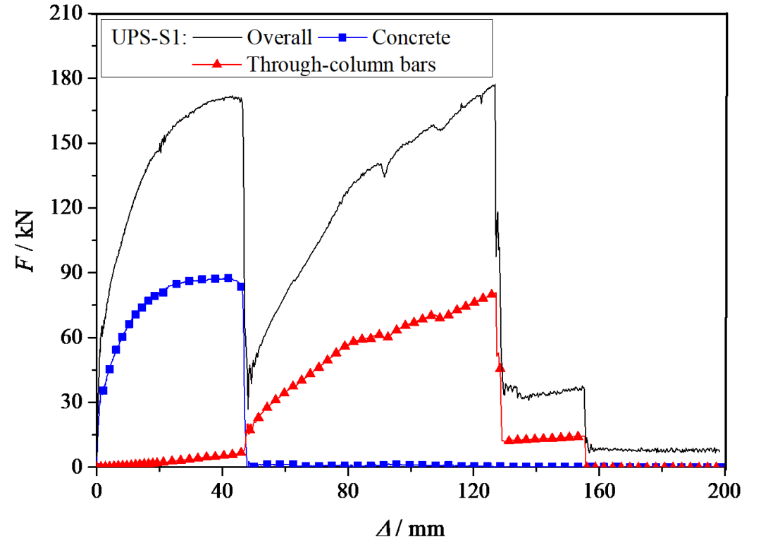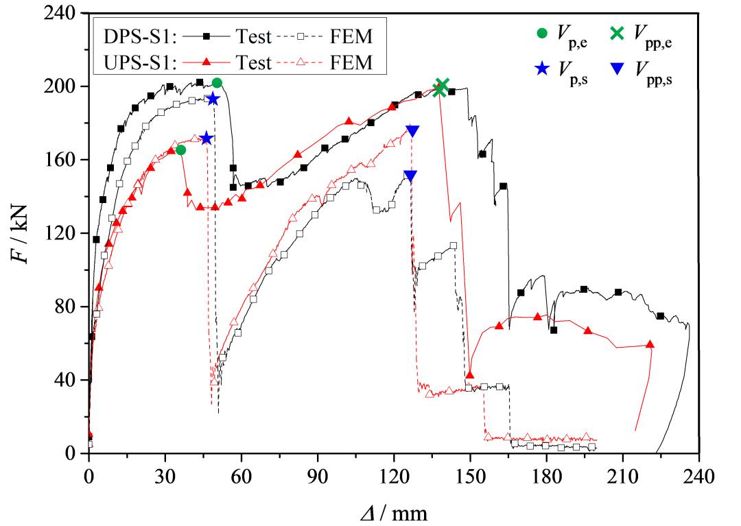 👉暗梁使得穿柱纵筋受力和变形协调,导致不同冲剪方向下的悬挂机制受力无明显区别(UPS-S1和DPS-S1)。暗梁能够同时提高试件受弯机制和悬挂机制的承载力峰值,且可提高悬挂机制下的变形能力;