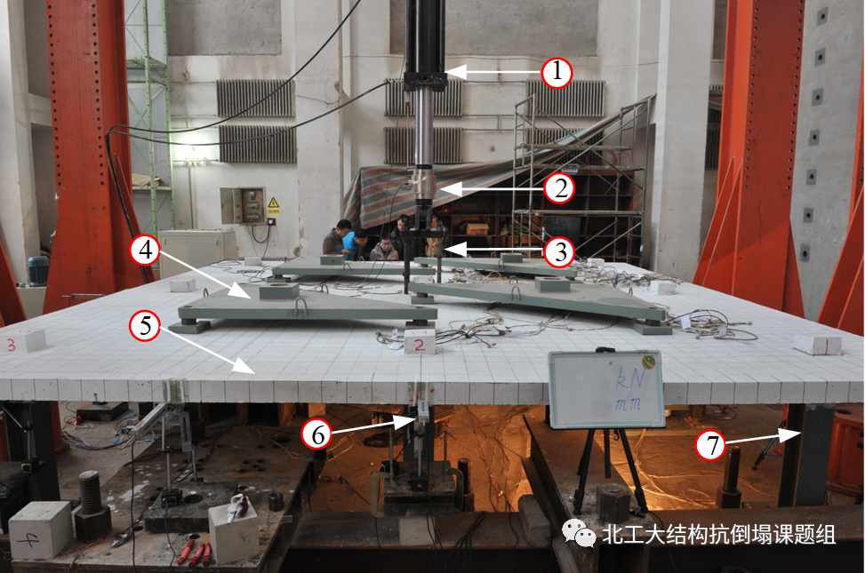 1: Hydraulic Jack; 2: Load cell; 3: Upward concentrated loading device; 4: Triangular steel plates (TSPs); 5: Flat slab substructure; 6: Horizontal LVDTs; 7: Steel columns.