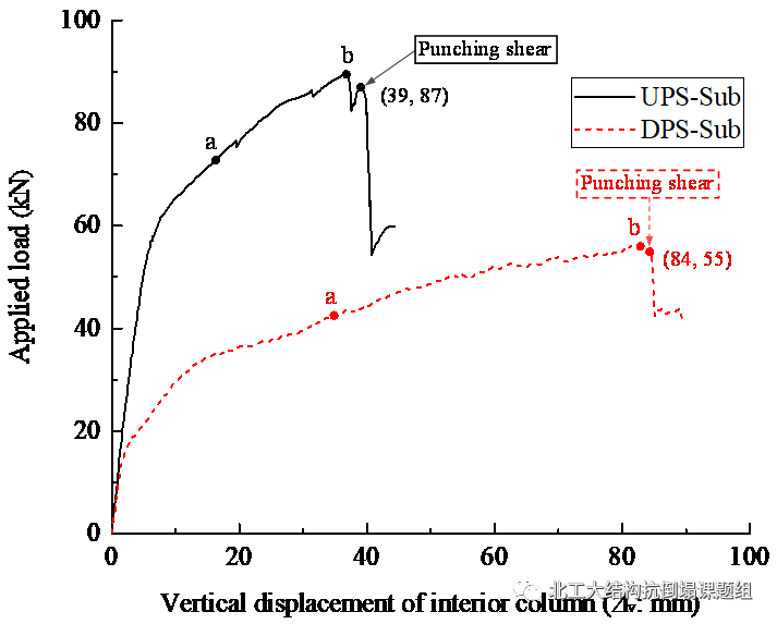 (1)在集中加载阶段阶段,UPS-Sub和DPS-Sub的分别表现为局部和整体失效模式。UPS-Sub的中柱节点冲剪承载力比DPS-Sub高58.2%,但对应的冲剪位移UPS-Sub比DPS-Sub低53.6%。然而,两个试件的中柱节点冲剪承载力均显著低于规范预测值。