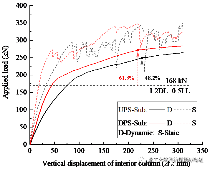 为了评估板柱子结构的动力倒塌抗力,通过简化的能量原理方法将结构的静力-位移曲线转化为动力-位移曲线,分析结果表明压膜机制下UPS-Sub和DPS-Sub动力倒塌抗力分别是设计荷载(1.2恒荷载+0.5活荷载)的1.095和1.030倍,而拉膜机制下分别为1.482和1.613倍(见图9)。因此,两个试件压膜机制下提供有限的动力倒塌抗力,但拉膜机制下能提供充足的动力倒塌抗力。