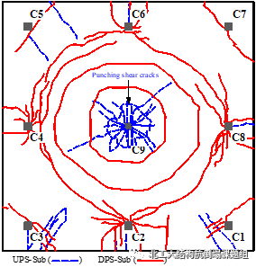 图6给出了拟均布加载LP-2阶段两个试件的力-位移曲线,UPS-Sub和DPS-Sub的承载力机制均可划分为压膜机制、转换和拉膜机制3个阶段。压膜机制阶段UPS-Sub(297 kN)的峰值承载力比DPS-Sub(274 kN)高8.4%,对应的竖向位移和水平位移分别高91.1%和57.1%,这表明集中加载阶段的向上残余变形有利于受压薄膜的受力。两个试件都是边中柱先冲剪,进而角柱冲剪,UPS-Sub和DPS-Sub所有柱(边柱和角柱)都发生冲剪破坏的位移分别为188 mm和175 mm,节点冲剪后可以通过受拉钢筋提供承载力,因此子结构的承载力可以继续提升。拉膜机制阶段,UPS-Sub和DPS-Sub冲剪后峰值承载力分别为346 kN和348 kN,这表明子结构的极限承载力不受初始冲剪方向的影响。LP-2(拟均布加载)阶段加载结束时UPS-Sub的板顶裂缝分布见图7,板顶裂缝呈环状分布且相互延伸产生交叉,边柱和角柱分别形成类似圆形和半圆形冲剪破坏区,需要说明的是DPS-Sub的裂缝分布与之类似,不再赘述。