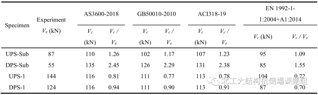 采用澳洲规范、中国规范、美国规范和欧洲规范评估LP-1(集中加载阶段)阶段中柱节点冲剪承载力(见表1),发现UPS-Sub和DPS-Sub试件的中柱节点承载力均显著低于规范预测值,可能是面内张力作用降低了节点的冲剪承载力。