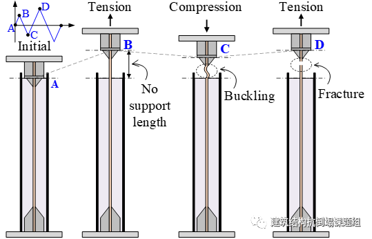 图5 脚部件内嵌钢板受压屈曲和受拉断裂过程