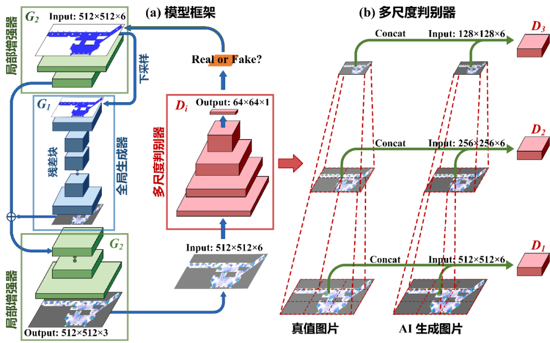 在前期测试中,我们发现大型建筑疏散预测任务对图像精度较高要求,需要至少512×512像素的高分辨率图像才能清晰识别建筑细节。同时,为了避免传统GAN模型 (Generative adversarial network,GAN) 模型在处理高分辨率图像时容易出现的梯度消失和模式崩塌,经横向对比,我们最终采用Pix2PixHD框架以及渐进式训练策略,对所述复杂建筑疏散预测模型进行构建。