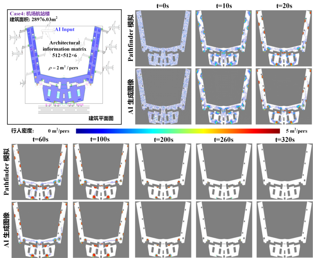 通过输入预处理后的建筑平面图,预训练后的AI模型可快速输出疏散全过程不同时刻下的人员密度热力图。以下展示了AI模型在真实大型机场航站楼测试案例中的预测表现。