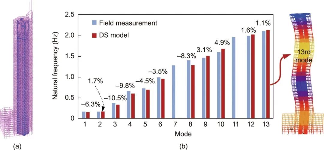 图3. (a)整个建筑物的DS模型和(b)模拟的固有频率和模态振型(条形附近的数字表示相对误差)。