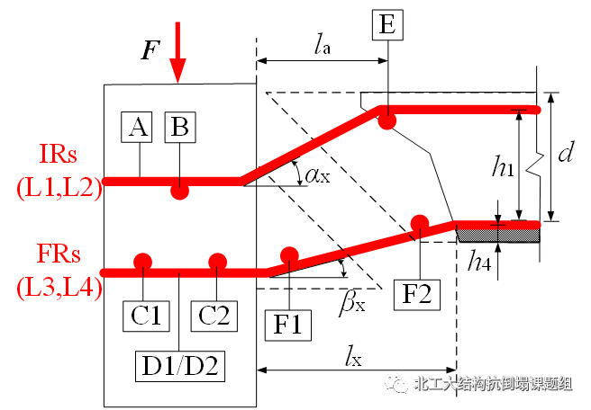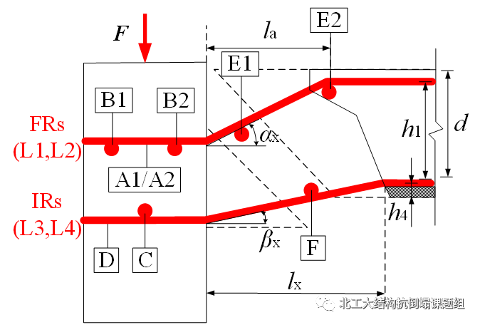 冲剪后承载力主要由穿柱的受弯钢筋(FRs)和整体性钢筋(IRs)提供。根据图4的机理示意图确定各层钢筋的转动变形和轴向应力,进而计算冲剪后承载力,这取决于钢筋受到的两类约束条件:1)钢筋有效约束,在大变形下最终断裂;2)钢筋受到部分混凝土约束,其应力状态可根据混凝土的抗崩裂强度确定。(具体推导和公式见论文)