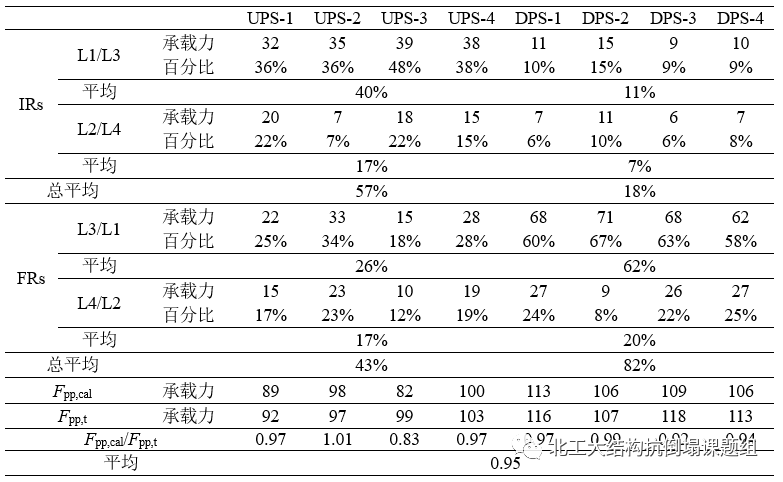 表2给出了冲剪后承载力计算结果(Fpp,cal)和试验结果(Fpp,t)的对比。Fpp,cal/Fpp,t平均值为0.95,表明计算准确率较高。根据该计算进一步确定了不同冲剪模式下各层钢筋的承载力贡献:UPS试件中IRs和FRs的总贡献率分别为57%和43%,而DPS系列中IRs和FRs的贡献率分别为18%和82%。