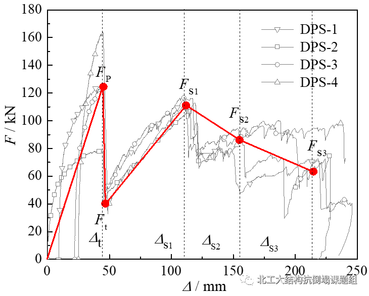 图3是UPS-1和DPS-1的承载力-位移曲线。冲剪破坏前,试件通过受弯抵抗外荷载。冲剪破坏后第一阶段(The first sub-stage),节点由穿过冲剪裂缝的钢筋提供承载力。
