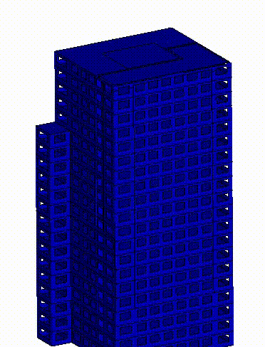 根据发布的相关信息,初步判定该结构主要是“墙板结构体系”。为简化分析,采用Belytschko-Tsay壳单元对所有墙体及楼板进行建模。模型共20层,加强层以上共17层,以下3层(如图1所示),内设核心筒。