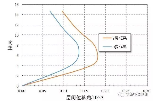 将云南乔后台站记录输入图4所示典型钢筋混凝土框架结构,得到其层间位移角包络如图5所示,7度区和8度区框架均基本无损伤。