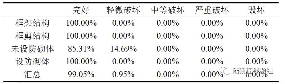 根据本课题组之前数据积累,将云南乔后台站的地面运动分别输入我国某8度设防区城乡结合部、某8度区大型城市。得到建筑破损情况如表1-表2所示。