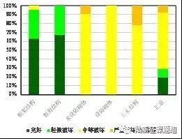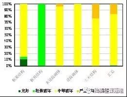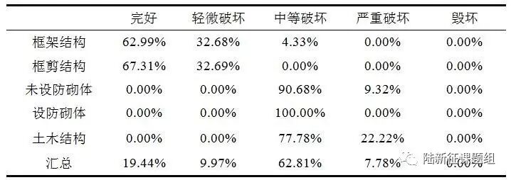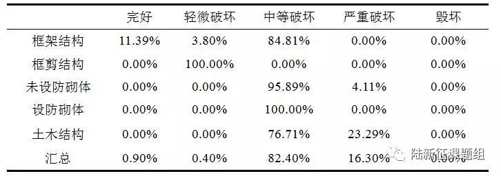 可见,本次地震对非设防砌体、低矮短周期结构破坏力较大,而对框剪结构和6层及6层以上钢筋混凝土框架的破坏能力较小。