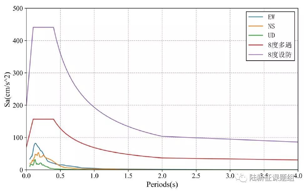 台站位置为北纬39.599度,东经117.000度,震中距38.3km。记录到水平向地震动峰值加速度为29.6 cm/s2,竖直向地震动峰值加速度为7.0 cm/s2 (图1)。该地震动与我国设计反应谱对比如图2所示。0212河北永清地震和0206台湾花莲地震震中附近地面运动强度对比如图3所示,可见花莲地震强度远高于永清地震。