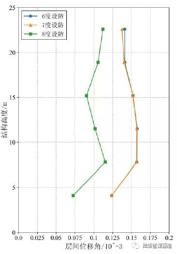 将河北河西务台站记录输入平面布置如图4 (a,b)所示的6度、7度和8度设防的典型钢筋混凝土框架结构,得到其层间位移角包络如图4 (c)所示,框架均无损伤。