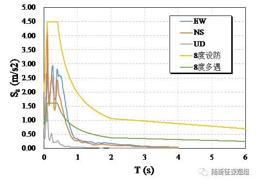 65WLG台站位置为北纬39.23度,东经76.77度(图1),记录到水平向地震动峰值加速度为105.94 cm/s2,竖直向地震动峰值加速度为30.92 cm/s2。该地震动与我国设计反应谱对比如图2、图3所示。