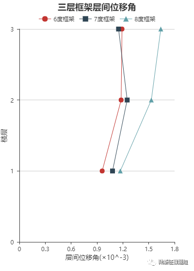 将65WLG台站记录输入立面布置如图5 (a)所示的6度、7度和8度设防的典型三层钢筋混凝土框架结构,得到其层间位移角包络如图5 (b)所示。