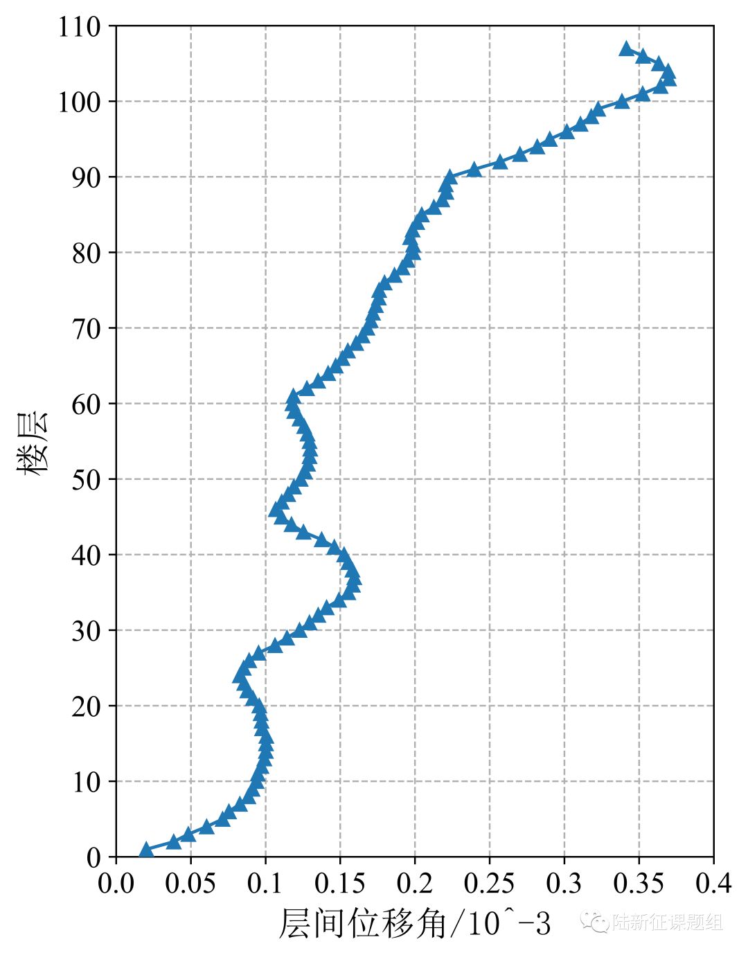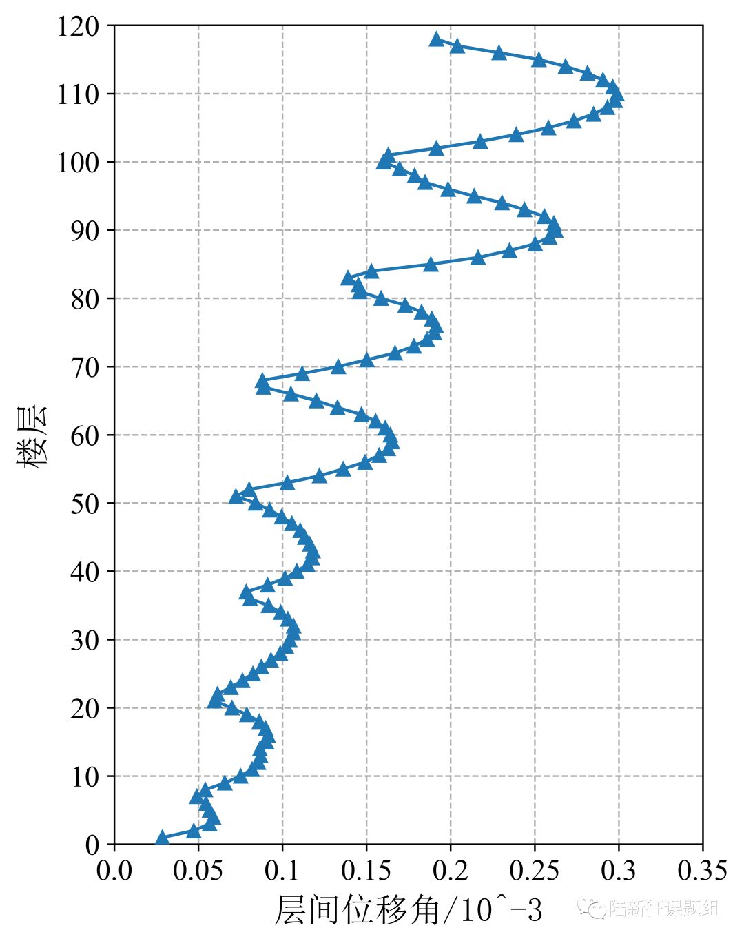 将65WLG台站记录输入图6 (a)所示某典型超高层结构1,得到其层间位移角包络如图6 (b)所示。