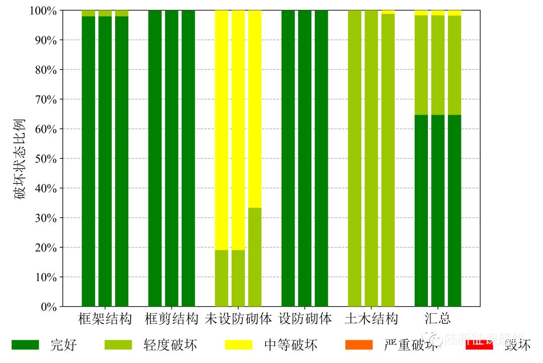 为了比较不同地震动对区域的破坏力,这里将地震动输入到清华校园619栋建筑中,其结构类型和建筑功能统计如图16所示。计算得到考虑承载力参数不确定性后建筑的破坏状态如图17所示,详细破坏状态比例如表4所示,清华校园典型建筑预测破坏状态如表5所示。
