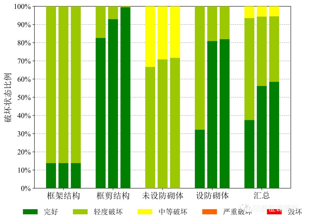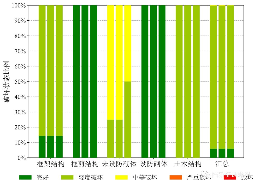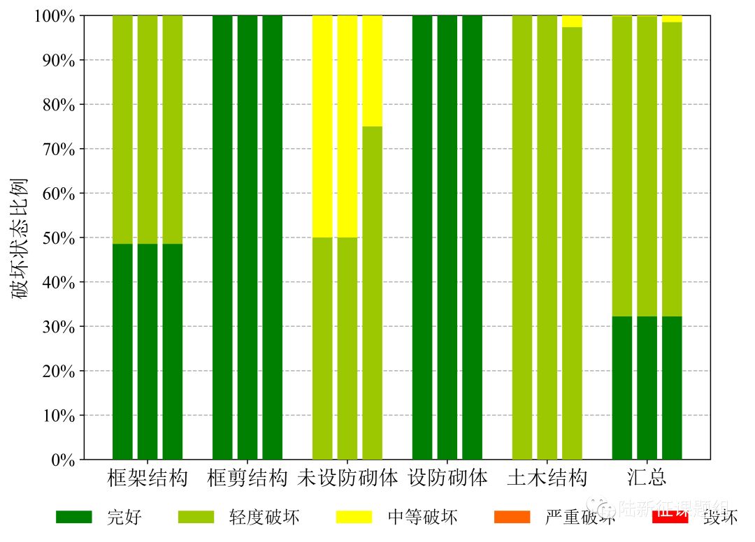 根据本课题组之前数据积累,将65WLG台站的地面运动分别输入新疆喀什地区典型城市、乡镇和典型农村,得到考虑建筑承载力参数不确定性后的破坏状态如图13-图15所示。图中每类结构有三列,分别为结构抗力取中位值和加减一倍标准差的预测结果。(说明:由于每个结构的实际抗震能力都是有一定不确定性的,所以我们在新版的程序当中加入了对结构抗力不确定性的考虑)。