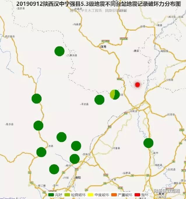 利用密布的强震台网在震后获取的实时地震动信息,再结合城市抗震弹塑性分析,就可以得到地震后不同地点的建筑破坏情况。根据本课题组之前数据积累,将不同台站得到的地面运动分别输入陕西汉中地区典型乡镇建筑。图4为20180912陕西汉中宁强县5.3级地震震中附近范围内台站记录分析得到的建筑震害分布示意图。