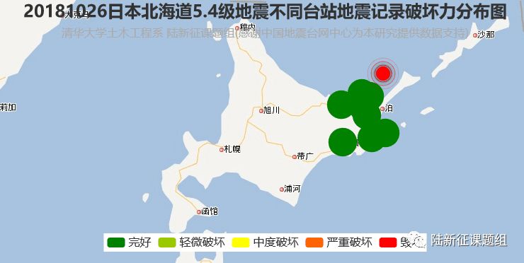 图3 20181026日本北海道地区5.4级地震不同台站地震记录破坏力分布图
