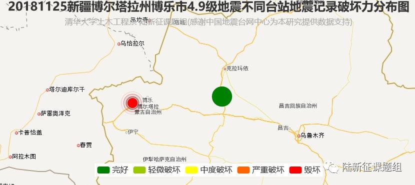 图4 2018年11月25日新疆博尔塔拉州博乐市4.9级地震台站地震记录破坏力分布图