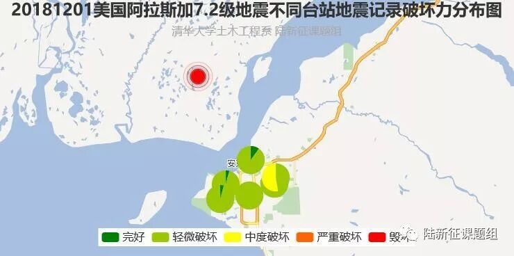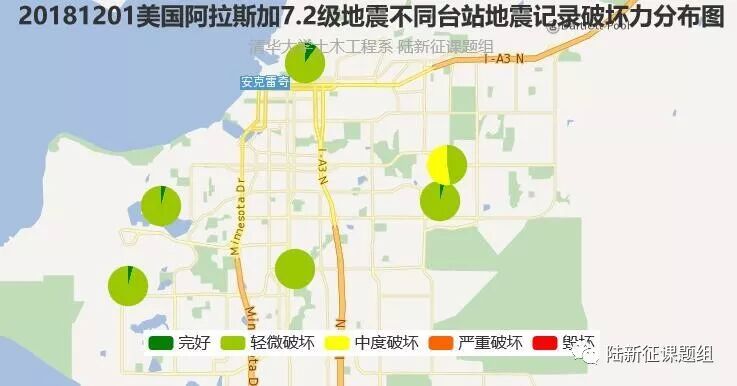 利用密布强震台网在震后获取的实时地震动信息,再结合城市抗震弹塑性分析,就可以得到地震发生后不同地点的建筑破坏情况,为抗震救灾决策提供科学支撑。图4为根据20181201美国阿拉斯加7.2级地震震中附近范围内台站记录分析得到的建筑震害分布示意图。点击“阅读原文”可以查看网页版地震力分布图。