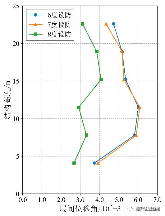 将8047台站记录输入立面布置如图5 (a)所示的6度、7度和8度设防的典型六层钢筋混凝土框架结构,得到其层间位移角包络如图5 (b)所示。