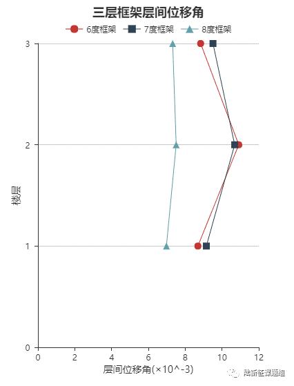 将8047台站记录输入立面布置如图6 (a)所示的6度、7度和8度设防的典型三层钢筋混凝土框架结构,得到其层间位移角包络如图6 (b)所示。
