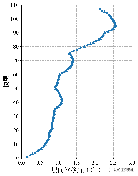 将8047台站记录输入图8 (a)所示某典型超高层结构2,得到其层间位移角包络如图8 (b)所示。