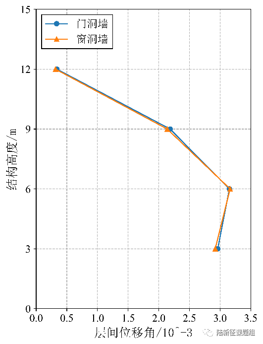 选取图11 所示许浒等提出的四层设防砌体模型,输入8047台站记录,得到其门洞墙和窗洞墙层间位移角包络如图11 (b)所示。(许浒等,砌体结构在地震下的非线性计算模型,四川建筑科学研究,2011(06): 170-175.)