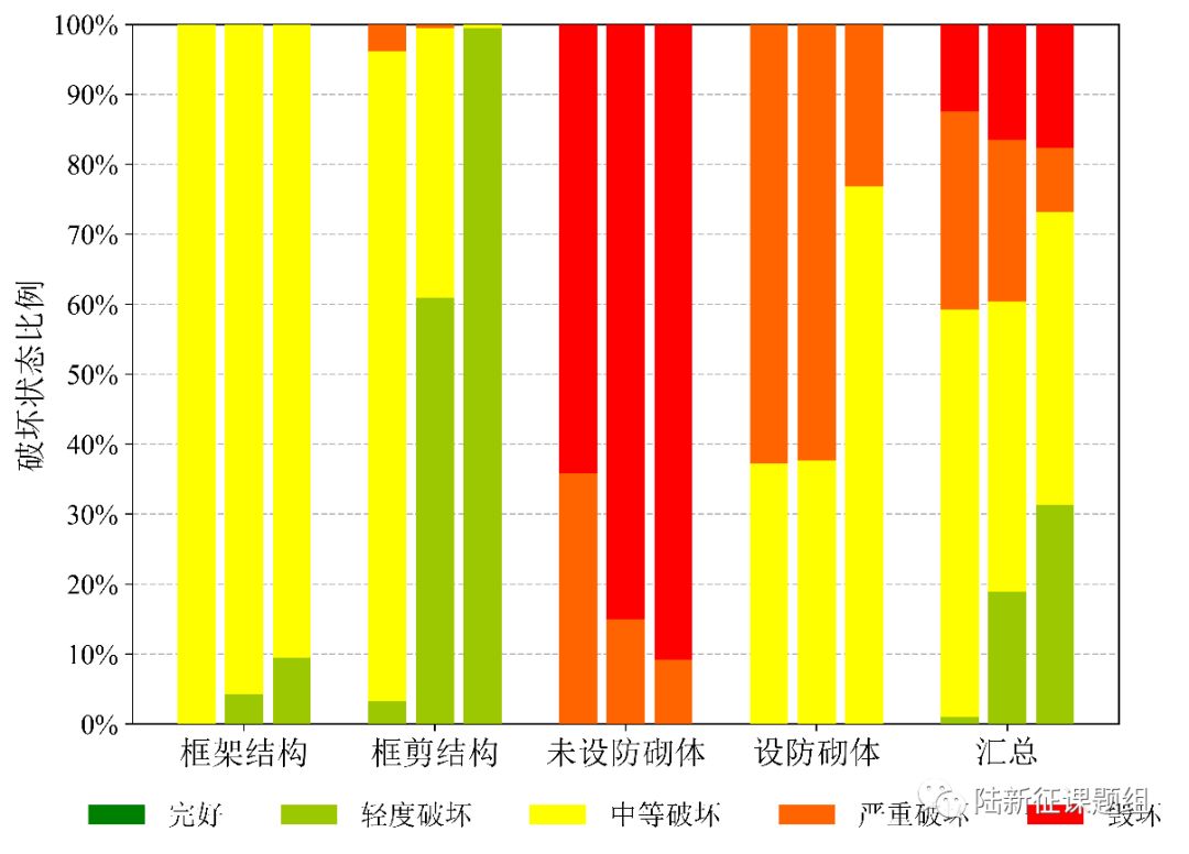 为了比较不同地震动对区域的破坏力,这里将地震动输入到清华校园619栋建筑中,其结构类型和建筑功能统计如图14所示。计算得到考虑承载力参数不确定性后建筑的破坏状态如图15所示,清华校园典型建筑预测破坏状态如表1所示。
