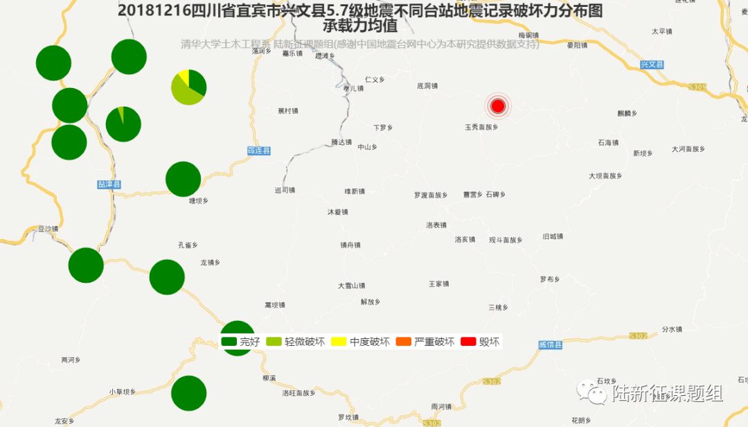 图4 2018年12月16日四川省宜宾市兴文县5.7级地震不同台站地震记录破坏力分布图