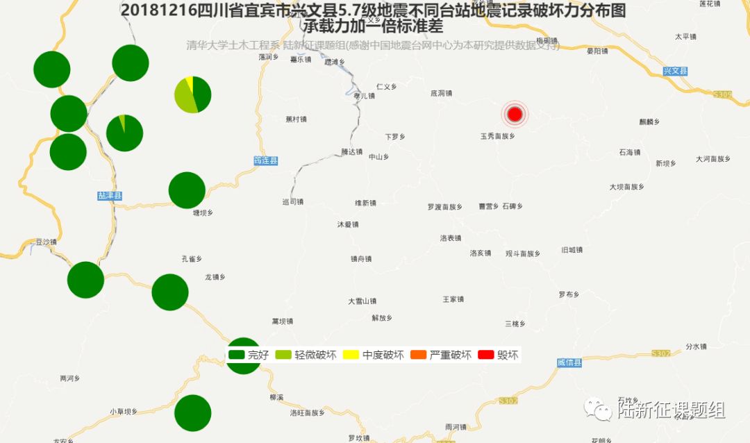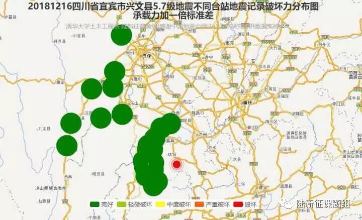 利用密布强震台网在震后获取的实时地震动信息,再结合城市抗震弹塑性分析,就可以得到地震发生后不同地点的建筑破坏情况,为抗震救灾决策提供科学支撑。图4、图5及图6为根据2018年12月16日四川省宜宾市兴文县5.7级地震震中附近范围内台站记录分析得到的建筑震害分布示意图。点击“阅读原文”可以查看网页版地震力分布图。