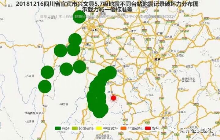 图5 2018年12月16日四川省宜宾市兴文县5.7级地震不同台站地震记录破坏力分布图