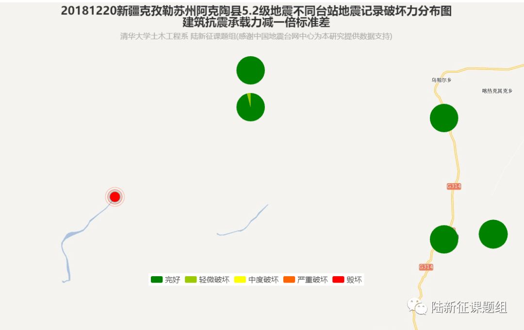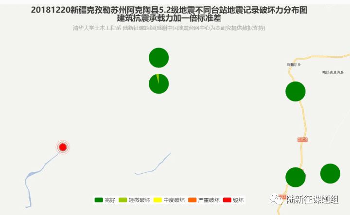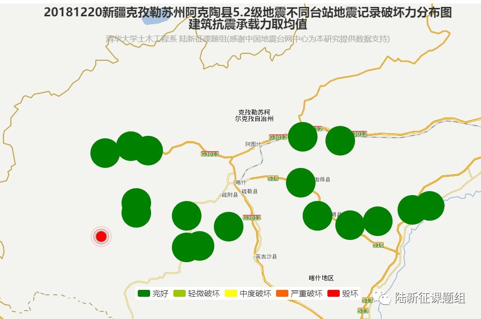 利用密布强震台网在震后获取的实时地震动信息,再结合城市抗震弹塑性分析,就可以得到地震发生后不同地点的建筑破坏情况,为抗震救灾决策提供科学支撑。图4、图5及图6为根据2018年12月20日新疆克孜勒苏州阿克陶县5.2级地震震中附近范围内台站记录分析得到的建筑震害分布示意图。点击“阅读原文”可以查看网页版地震力分布图。