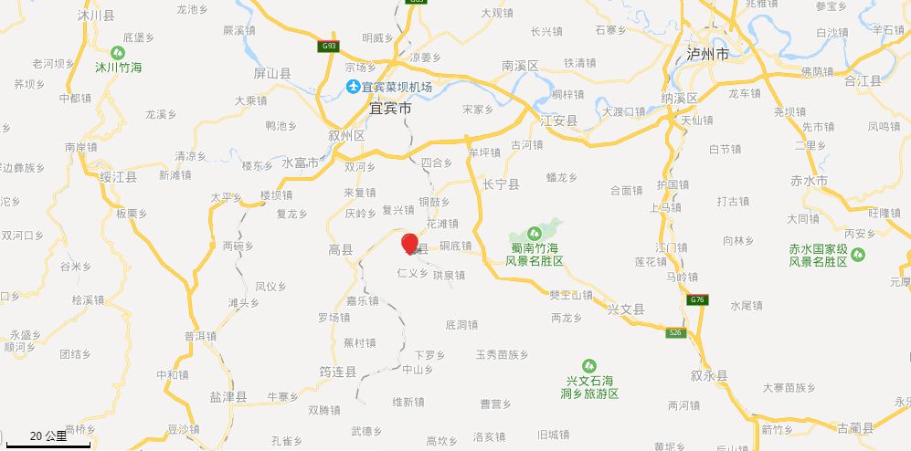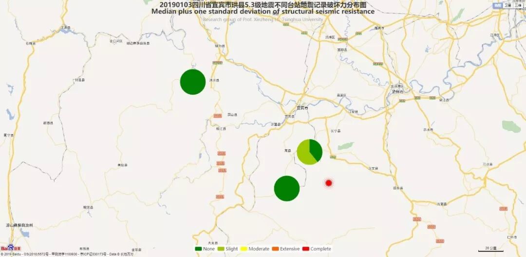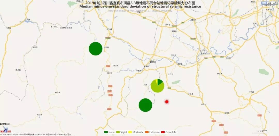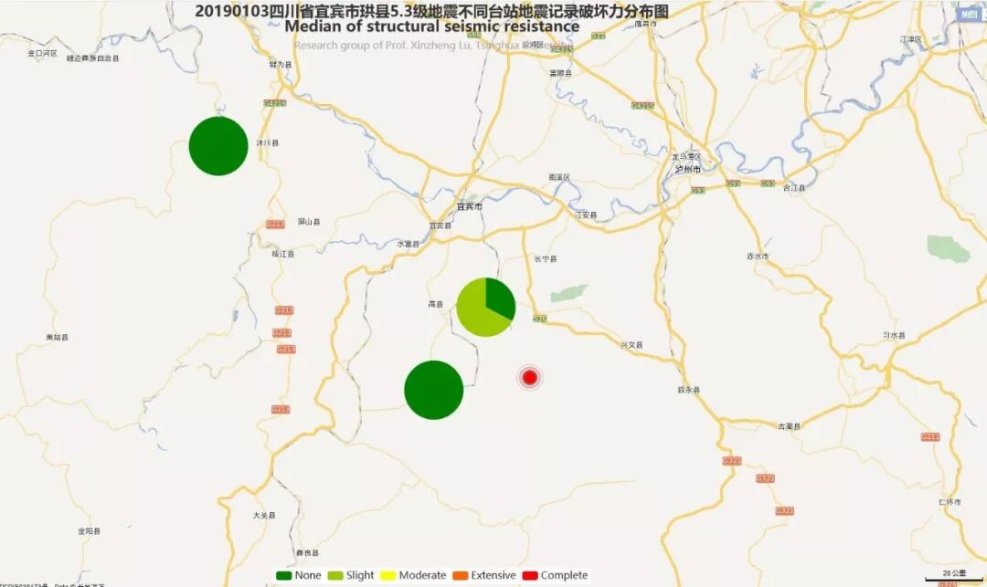 利用密布强震台网在震后获取的实时地震动信息,再结合城市抗震弹塑性分析,就可以得到地震发生后不同地点的建筑破坏情况,为抗震救灾决策提供科学支撑。图4、图5及图6为根据2019年01月03日四川省宜宾市珙县5.3级地震震中附近范围内台站记录分析得到的建筑震害分布示意图。点击“阅读原文”可以查看网页版地震力分布图。