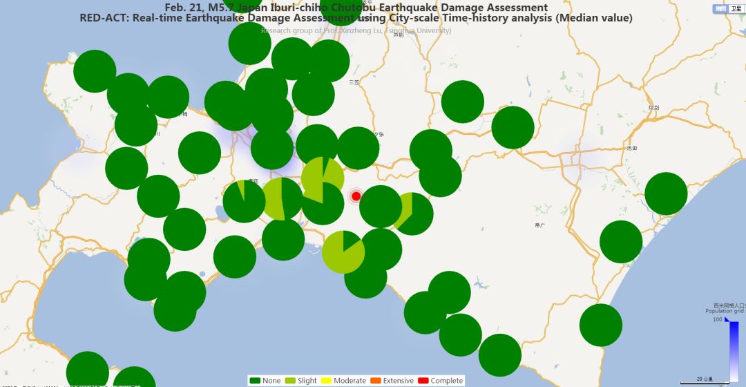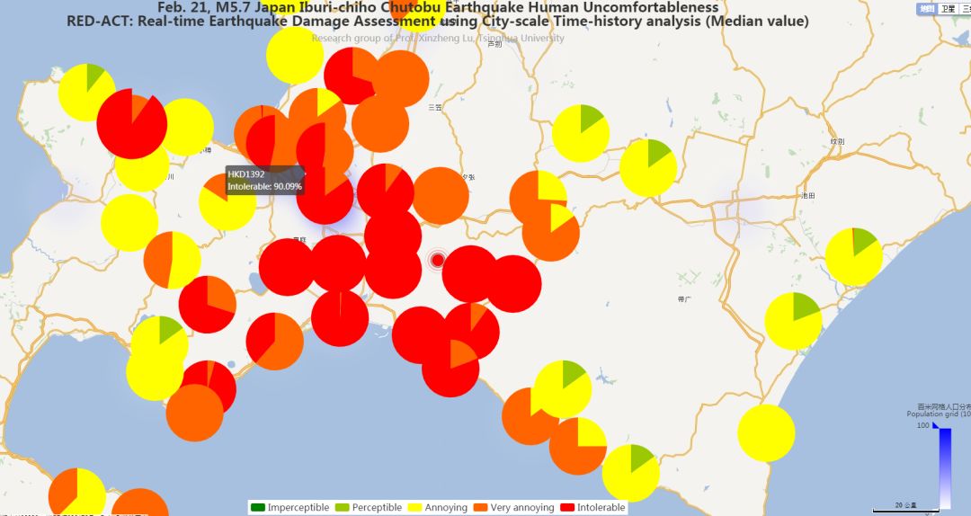 利用密布强震台网在震后获取的实时地震动信息,再结合城市抗震弹塑性分析,就可以得到地震发生后不同地点的建筑破坏情况,为抗震救灾决策提供科学支撑。图4(a)(b)为根据20190221日本北海道地区5.5级地震震中附近范围内台站记录分析得到的建筑震害分布示意图,图4(c)为根据20190221日本北海道地区5.5级地震震中附近范围内台站记录分析得到的人员加速度感受分布示意图。分析区域建筑参考北京地区。点击“阅读原文”可以查看网页版震害与震感分布示意图。