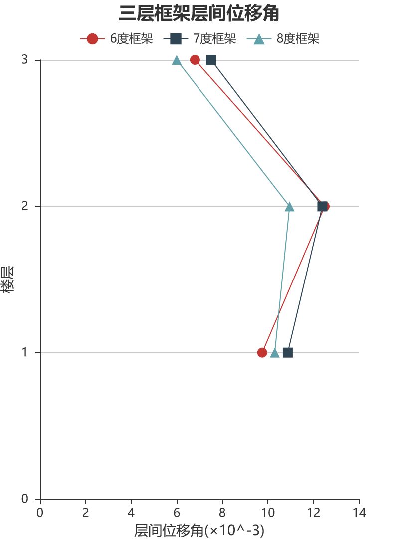 将HKD126台站记录输入立面布置如图6 (a)所示的6度、7度和8度设防的典型三层钢筋混凝土框架结构,得到其层间位移角包络如图6 (b)所示。