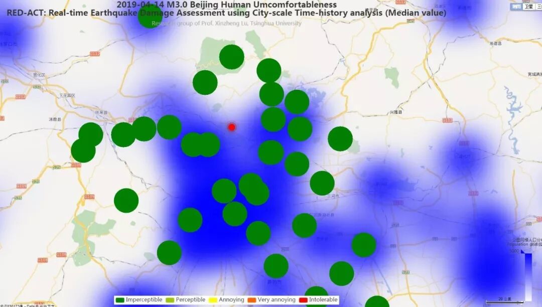 利用密布强震台网在震后获取的实时地震动信息,再结合城市抗震弹塑性分析,就可以得到地震发生后不同地点的建筑破坏情况,为抗震救灾决策提供科学支撑。图4为根据20190414北京怀柔区3.0级地震震中附近范围内台站记录分析得到的建筑震害分布示意图,图5为根据20190414北京怀柔区3.0级地震震中附近范围内台站记录分析得到的人员加速度感受分布示意图。