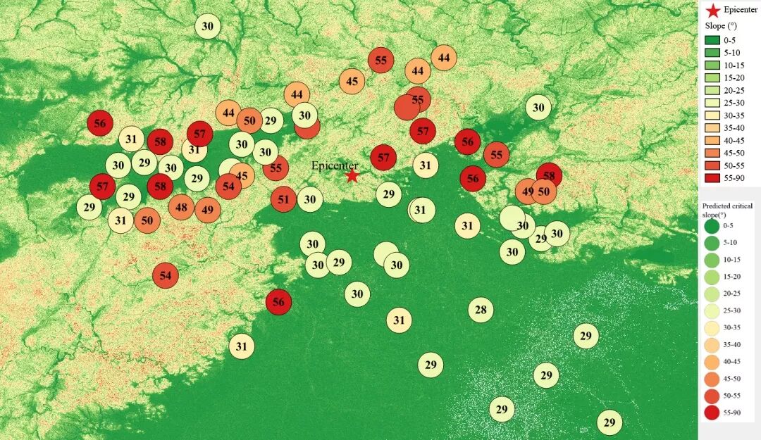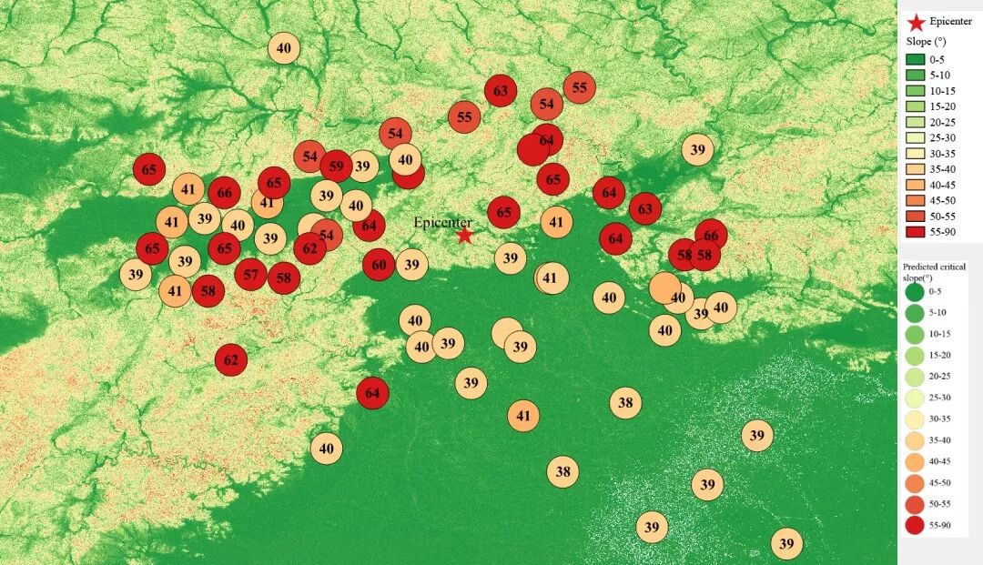 根据当地地形数据、岩性数据和实测地面运动记录,可以计算得到不同滑坡体饱和比例下的滑坡分布,如图6所示。其中,底图为当地坡度分布图,每个圆圈代表每个台站的计算结果,圆圈中的数字代表发生滑坡的临界坡度,台站附近坡度大于该数值的地方滑坡发生概率高。