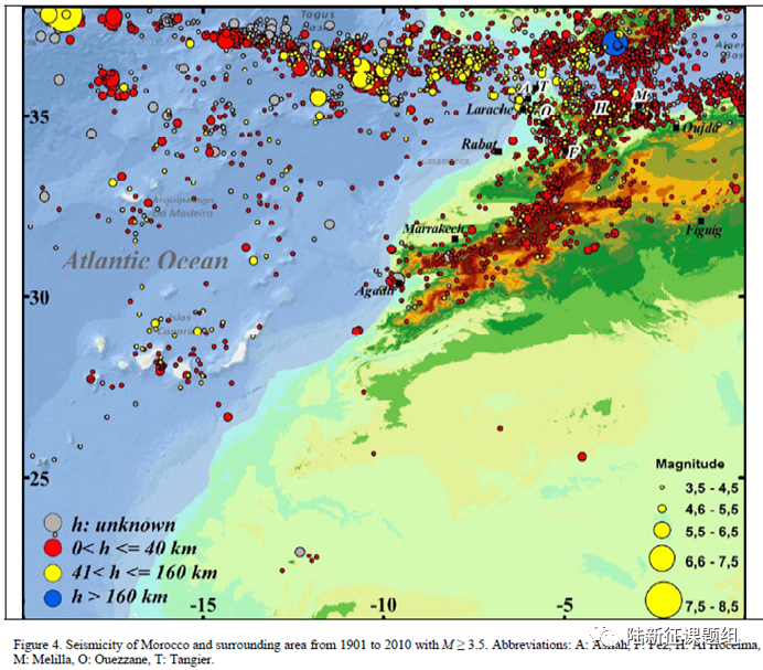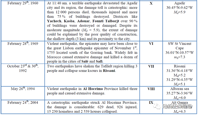 地震发生后,我们关注了有关方面的信息,由于摩洛哥的相应机构Centre National de la Recherche Scientifique et Technique -- Morocco (CNRST)网站一直处于瘫痪状态,看来短期难以获取当地地面运动数据了。在此期间我们做了一点背景研究,根据Cherkaoui & Hassani (2012)的论文, 1960 年的Agadir地震摧毁了这座城市和几个村庄,并造成 12,000 人死亡。2004 年摩洛哥北部Al Hoceima发生地震,造成 629 人死亡(图2、3)。 不过根据表1,相对而言摩洛哥的地震灾害还不算太严重。