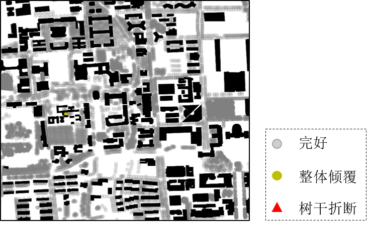 西北风下5级、6级、7级、8级及9级情况下评估结果分别如图1-5所示。需要说明的是,本次分析为了更直观地与实际调研结果进行对比,直接给出了树木倾覆、折断或者完好的评判结果,而论文的案例分析中给出的是树木破坏风险(依据树木风荷载与树木抗力的大小关系分为了“低”、“中等”、“高”、“很高”四个等级)。因此在评估结果可视化上存在差异。
